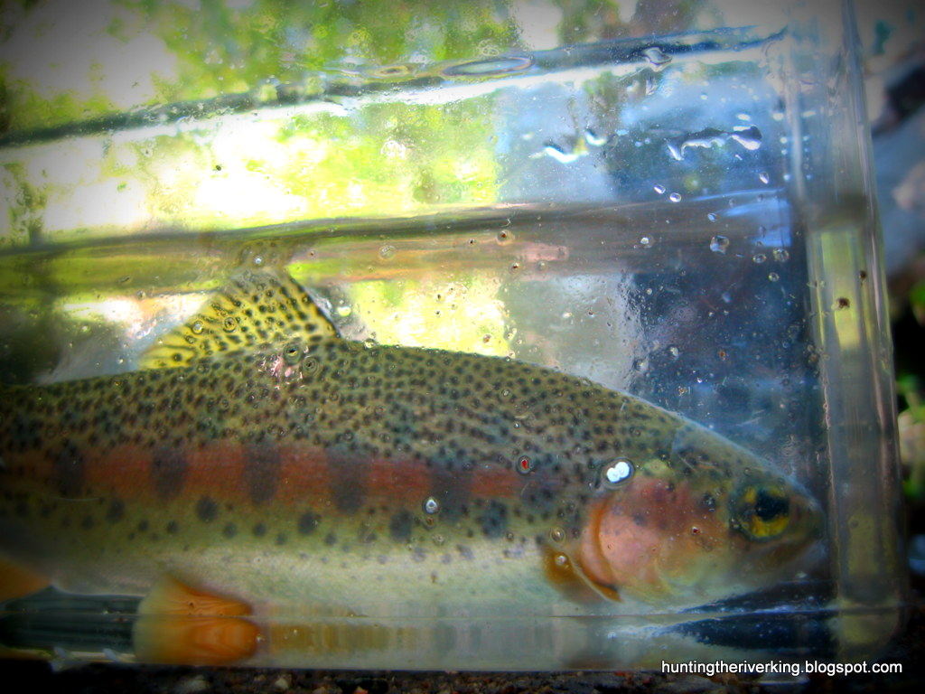 Keeping them out of water too long for a picture unduly stresses them, making it difficult to get a nice shot. Instead, I brought along a small "trout box", a clear plastic container, filled with (on occasion) stream water, to allow the trout to calm down and get a nice photo.